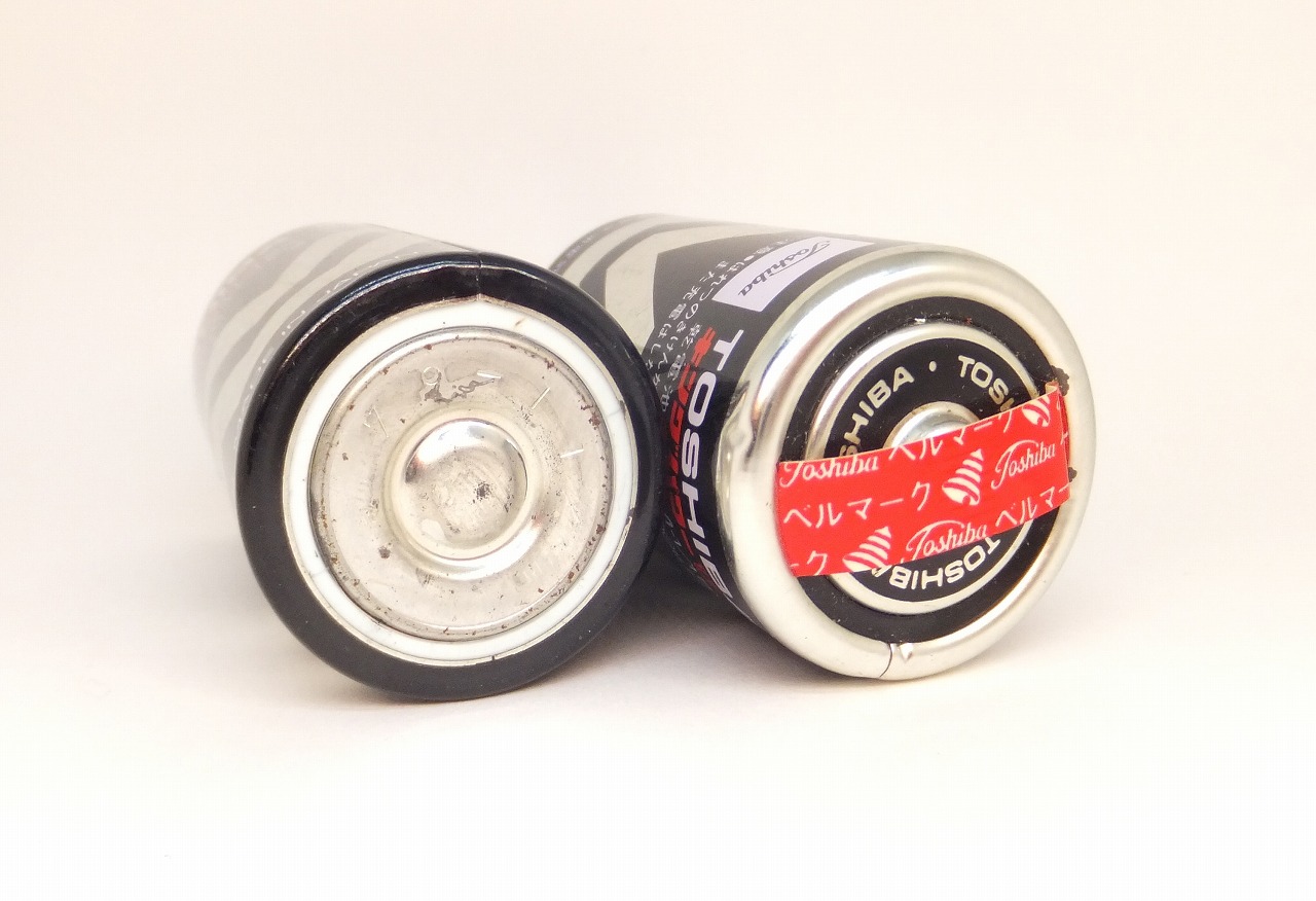 缶外装であるので一度電解液が噴出してしまうと塗装も剥がれてしまう中でかろうじて展示できるレベルの電池である。
