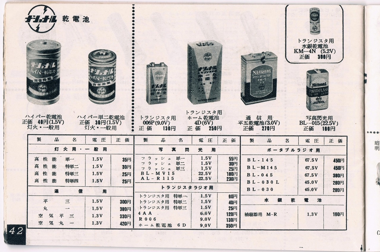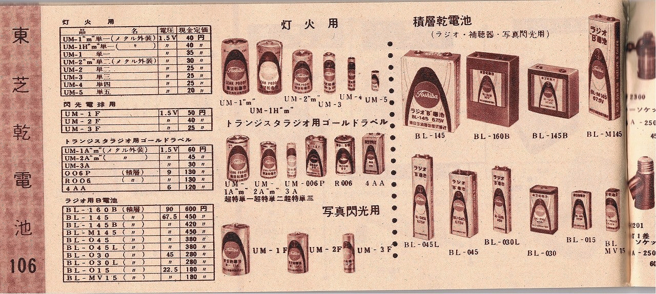 1.東京芝浦電気1962年9月21日現在の家電カタログ No.42より乾電池P106より抜粋