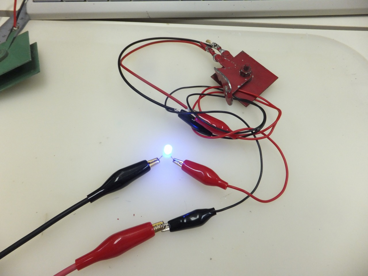 次にダイオードを逆方向に接続して同じく電源装置から3.3Vを印加します。 若干LEDが点灯していることがわかります。この時にLEDには0.258mA流れておりました。 この実験からわかることが "比較的低電圧からセレンは逆方向電圧も通過する" 事がわかります。 つまり「整流素子としては適さないデバイスの可能性」が大きくなります。