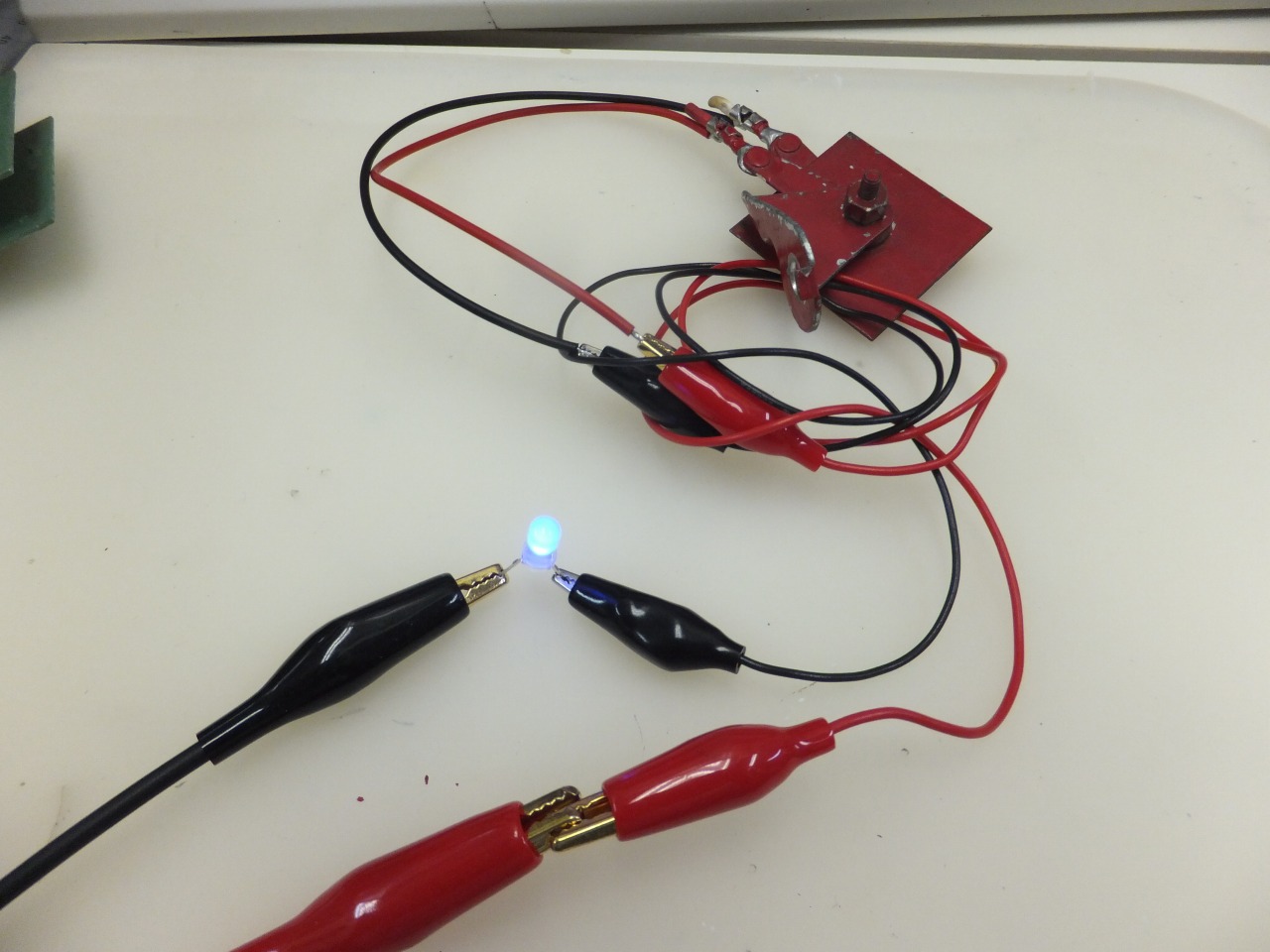 ここからちょっとだけ専門的にな話に移ります。 電源装置を3.3Vにセットして高輝度青色LEDにつなぎます。このテストではダイオードの順方向に 3.3Vを流してLEDは明るく光りました。この時には4.916mAが流れました。