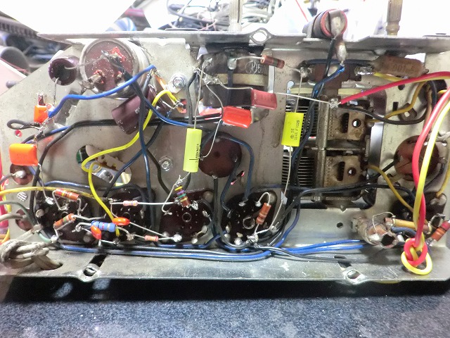 シャーシ内部の様子。コンデンサは全滅。抵抗器も抵抗値がすべて適正外。