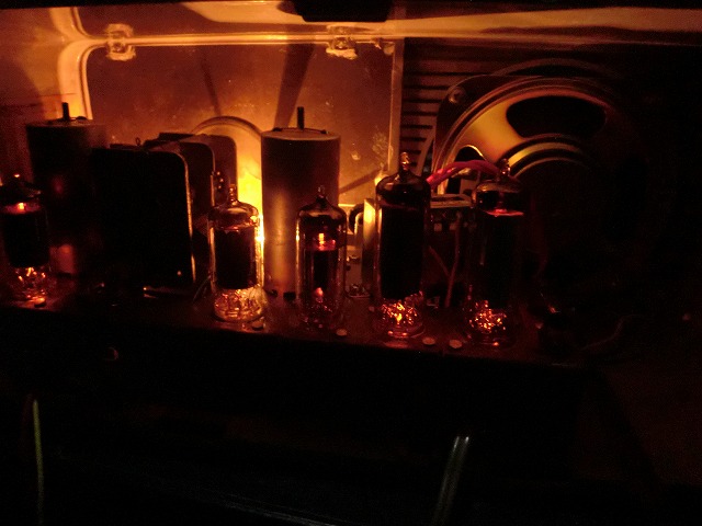 というわけで、自宅に帰り配線をきれいに直して試験運転中・・。佐野博士のために今回は新品の真空管を